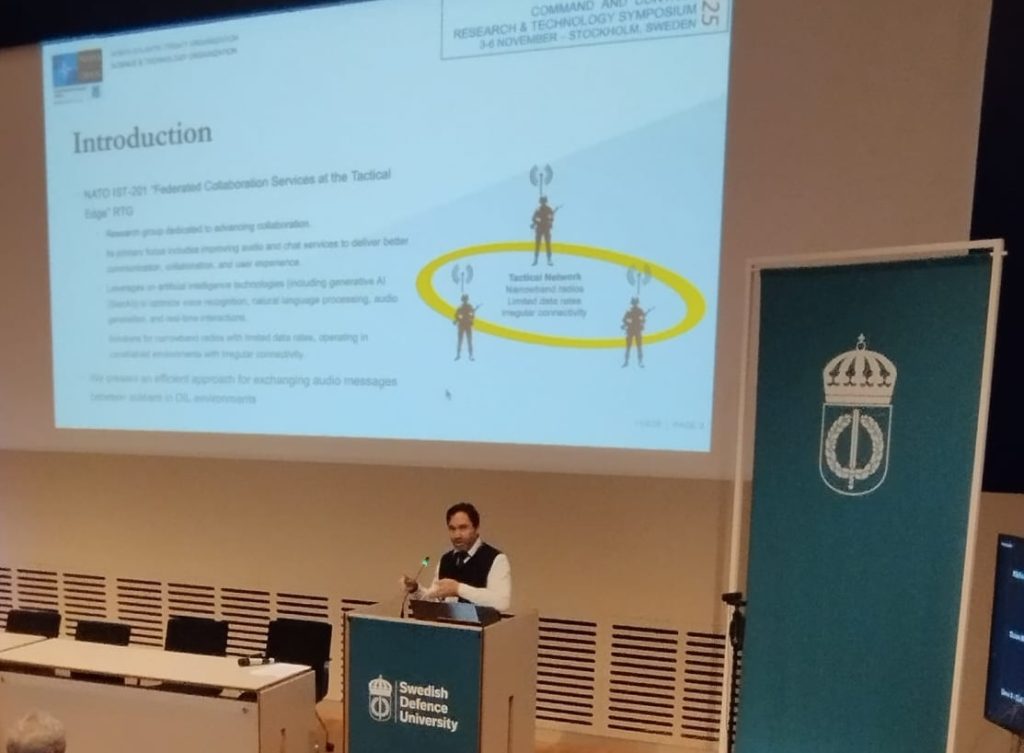 On November 4th 2025, Marco Manso (from PARTICLE) presented the IST-201 paper “Efficient Digital Voice and Chat Communications through Generative AI at the Tactical Edge” at the 30th edition of the International Command and Control Research Technology Symposium, hosted by the Swedish Defence University in collaboration with the Swedish Defence Research Agency and organised by the International Command and Control Institute. Gathering almost 200 experts in the command and control domain for four days, this is one of the world’s premier scientific conferences on topics related to Command and Control.